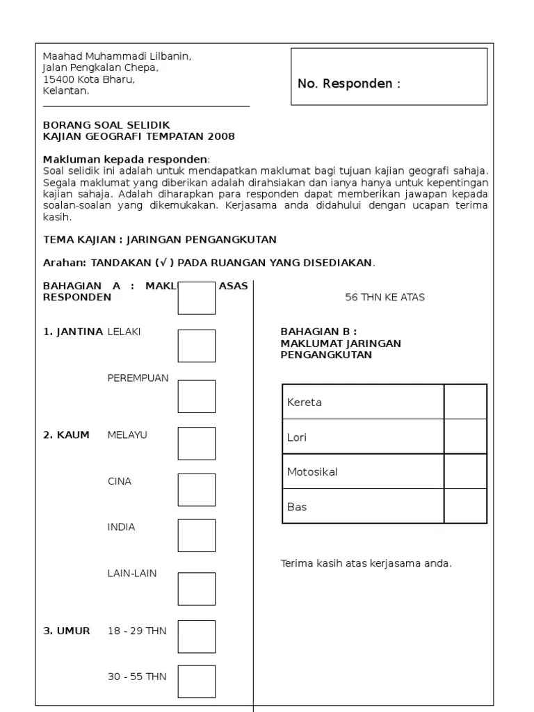 Contoh borang soal selidik geografi tingkatan 2 pengangkutan awam. Saya menggunakan kaedah ini untuk mengetahui kepentingan pengangkutan awam di kawasan kajian. Kerja lapangan geografi tingkatan 2, smk (p) methodist klang.