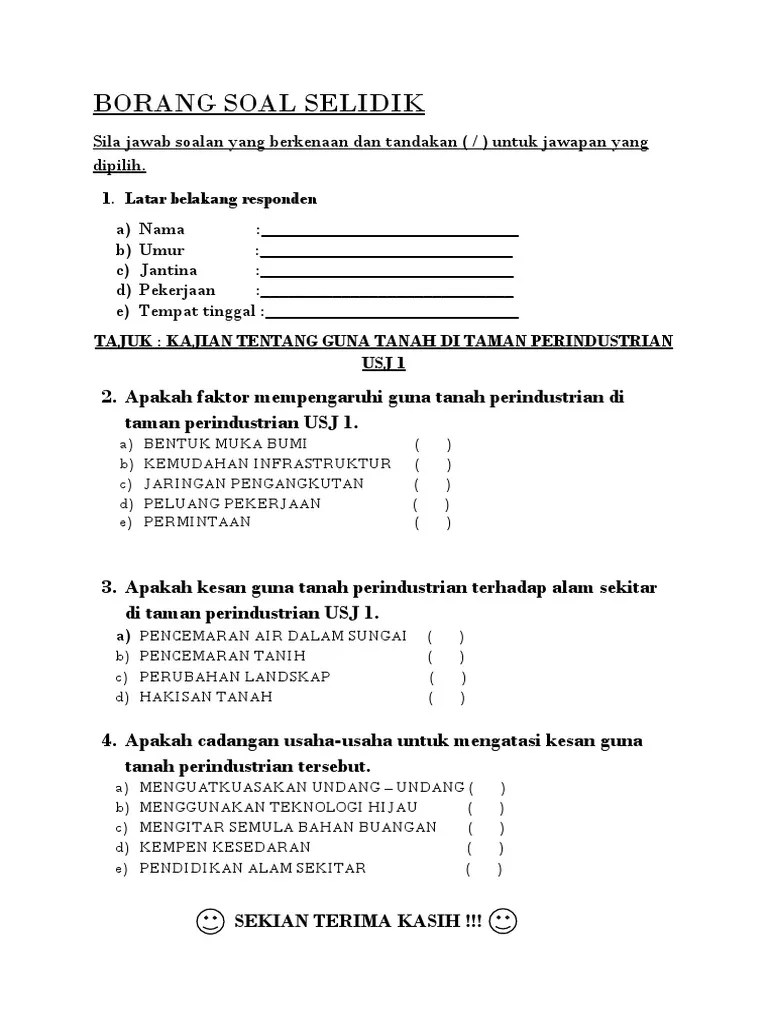2) surat kebenaran membuat kajian 3) borang soal selidik 18 rujukan laman . Jenis kenderaan yang anda miliki : Soalan tugasan bagi tajuk kajian di kawasan anda, terbaik untuk anda rujuk.